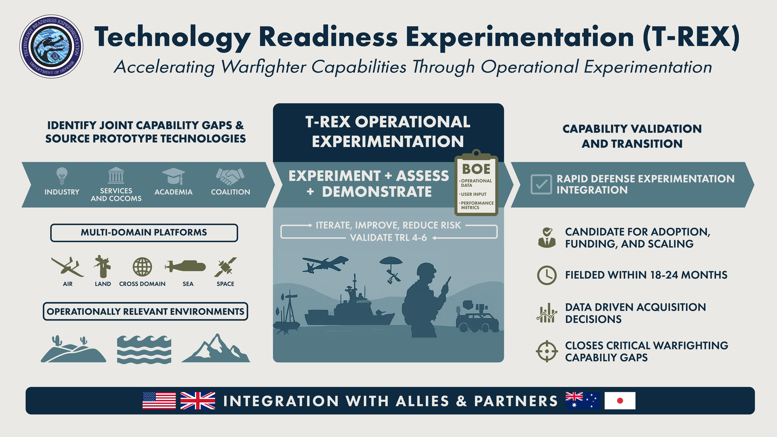 Technology Readiness Experimentation (T-REX) events provide operationally relevant environments that allows technology to be properly assessed within Technology Readiness Levels (TRL) 4-6 as a proponent in a Tier 1 Activity before a Tier 2 Joint Rapid Experimentation System of Systems validation.